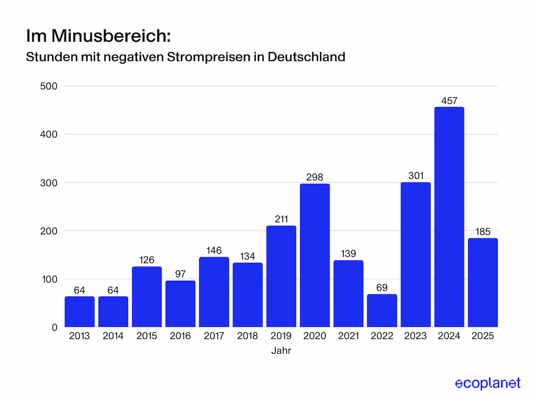- Die Häufigkeit negativer Strompreise steigt kontinuierlich – 2024 gab es bereits 457 Stunden mit negativen Strompreisen, ein deutlicher Anstieg gegenüber 301 Stunden in 2023.